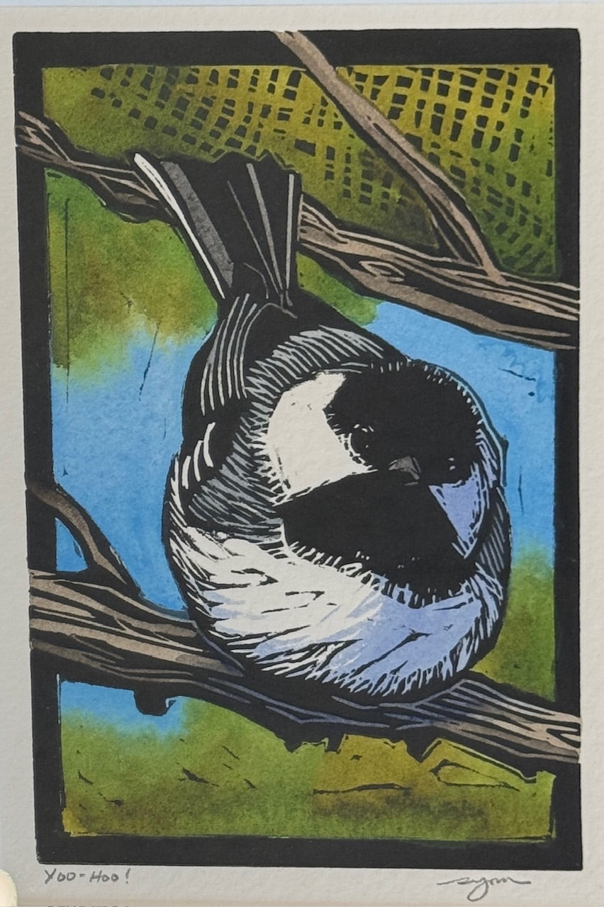 Sherrie York's reduction linocut print of a perched chickadee invites you to pause and observe the subtle beauty of nature. Let this artwork remind you daily that sometimes the most meaningful experiences come from simply being present and truly seeing what's around you.