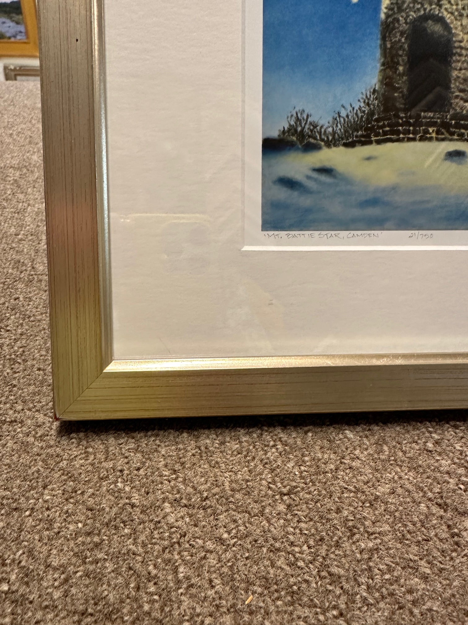 Mt. Battie Star, Camden is a limited-edition print by Heather Spenser, originally created with pastel pencil. This well-loved icon shines down on Camden village and harbor during the holiday season.