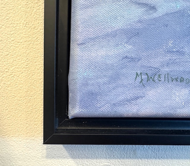 It measures approximately 15.5" x 15.5" and is canvas wrapped and placed in a modern black floater frame by the artist.
