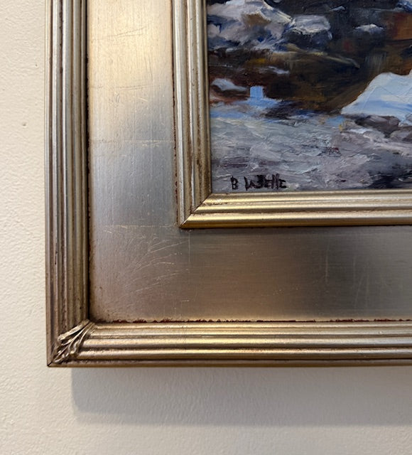 The painting measures 12" x 16" and is framed by the artist in a classic silver wood frame, as shown, with final measurements approximately 18" x 22".