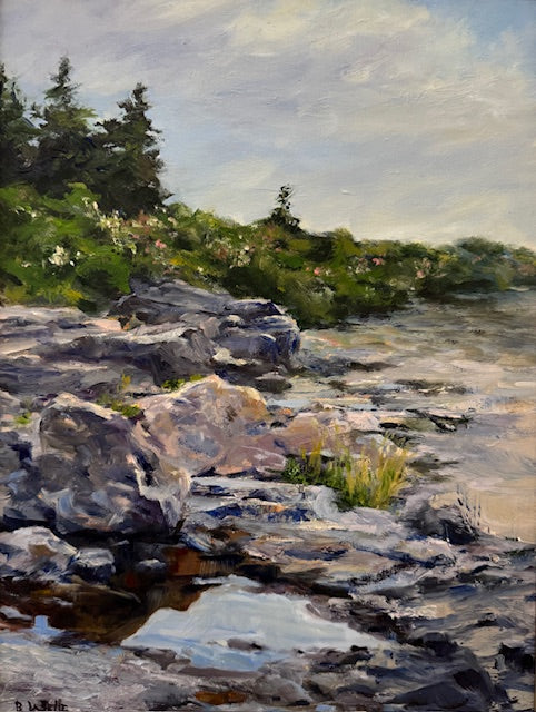 This scene captures a peaceful exploration along Maine's rocky coastline in summertime, with colorful beach roses dotting the shoreline.